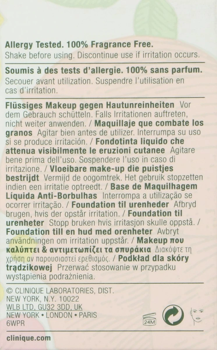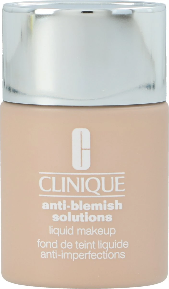 De Anti-Blemish Solutions Liquid foundation van Clinique voelt fris aan en ziet er natuurlijk uit. De foundation is olievrij, camoufleert oneffenheden en onzuiverheden en neutraliseert roodheid. De foundation is geformuleerd met helende ingrediënten die helpen bij de behandeling en genezing van bestaande puistjes en helpen toekomstige puistjes te voorkomen.